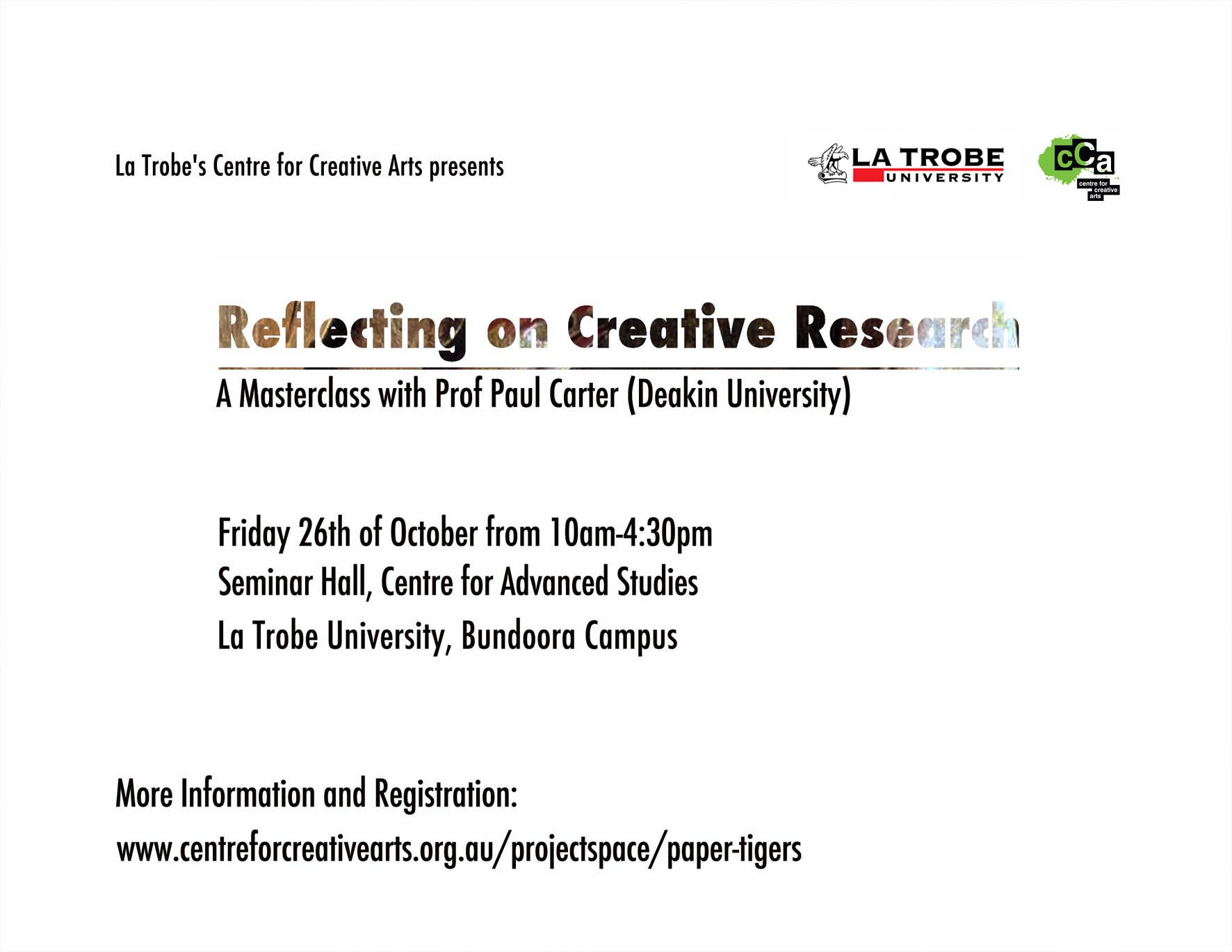 Creative Arts practices are now accepted academic pursuits. With this form of research come new challenges for masters and PhD students. The difficulty we face is how to merge these creative projects with the expectations of academia. With support from the Centre for Creative Arts (La Trobe), Paper Tigers as its postgraduate initiative seeks postgraduates students interested in creative research, to participate in a workshop led by Professor Paul Carter (Deakin University). The aim of the MASTERCLASS is to pinpoint issues relating to how we think through creative practices in a university environment.