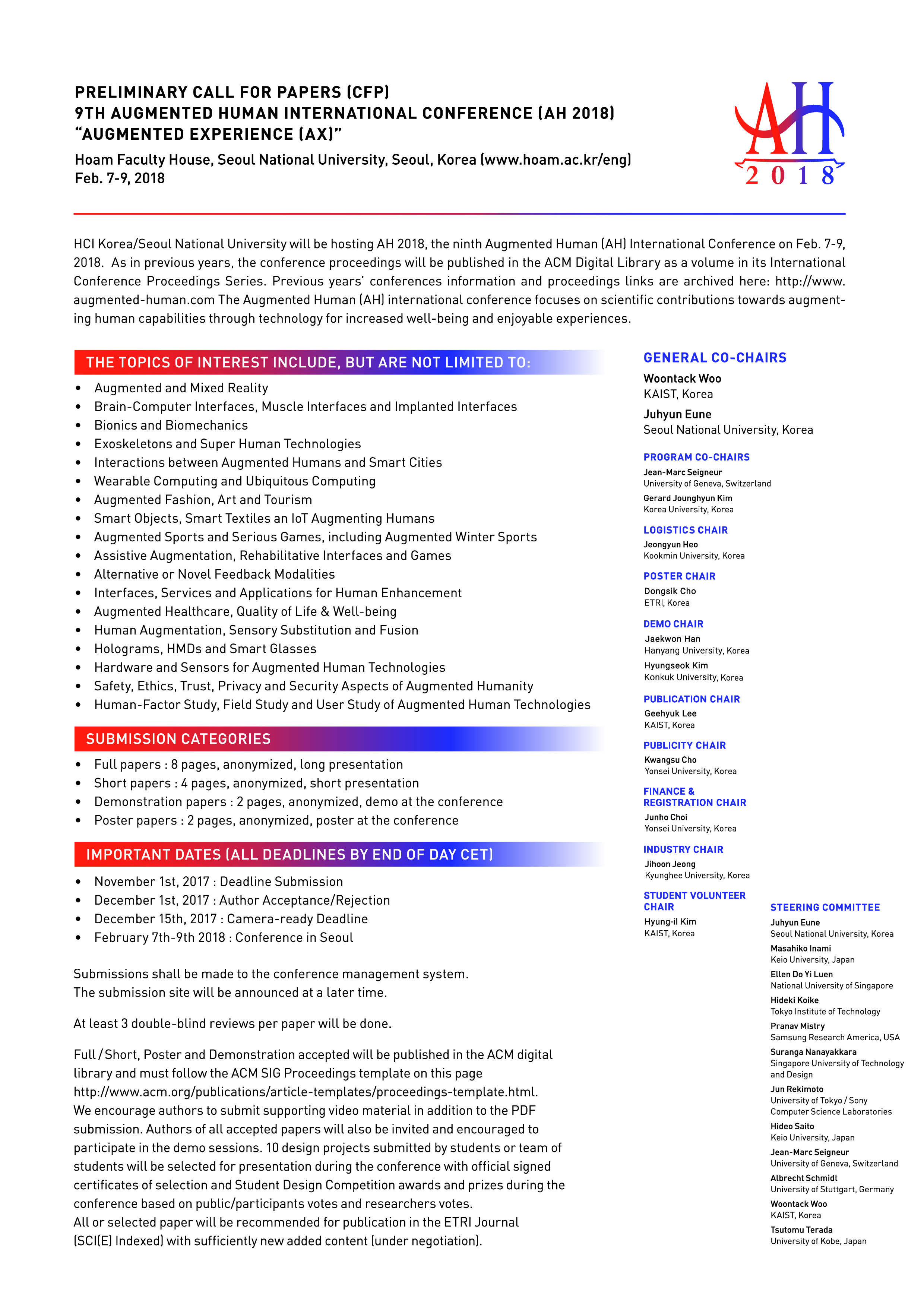 Human-Computer Interaction Korea and Seoul National University are hosting AH 2018, the ninth Augmented Human (AH) International Conference, Feb. 7-9, 2018. AH international conferences focus on scientific endeavors towards augmenting human capabilities through technology for increased well-being and enjoyable experiences. As in previous years, the conference proceedings will be published in the ACM Digital Library as a volume in its International Conference Proceedings Series. Previous AH conferences’ information and proceedings links are archived here at http://www.augmented-human.com.