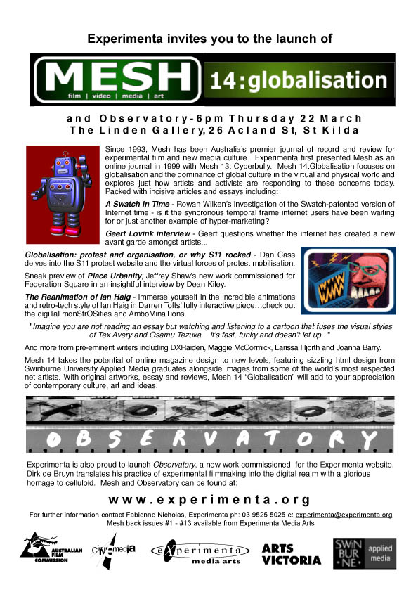Hello Could you please send out the following to your subscriber list. Thankyou, Nag Vladermersky. Experimenta is proud to announce the launch of Mesh Issue 14 : Globalisation and Observatory, a new work commissioned for the Experimenta online gallery by Dirk de Bruyn. When: Thursday March 22nd Time: 6pm. Where: The Linden Gallery, 26 Acland St, St.Kilda. Please come along! -- ------------------------------------------------------------------------ EXPERIMENTA MEDIA ARTS exhibits and promotes media arts that explore new aesthetic, conceptual and technological boundaries. for information about EXPERIMENTA recent and forthcoming events: www.experimenta.org Experimenta Staff Executive Producer: Fabienne Nicholas Artistic Director: Lisa Logan Co-ordinator: Nag Vladermersky Address: PO Box 1102 St Kilda South Victoria, 3182 Australia Contact: ph: 61 3 9525 5025 fax: 61 3 9525 5105 email: experimenta@experimenta.org Experimenta Media Arts gratefully acknowledges the support of the Australian Film Commission, Cinemedia, Australia Council for the Arts and Arts Victoria.
