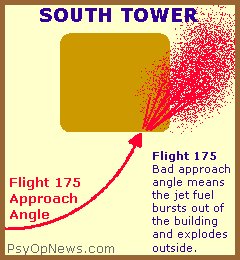 A wash of jet fuel and airplane parts tore through the interior of the building at hundreds of miles an hour; sweeping everything before it and just starting to ignite as it rushed along. But it didn't take the same course as had aircraft debris inside the North Tower, eighteen minutes before. By contrast, the majority of the fuel and debris from the second plane smashed out of the building and exploded OUTSIDE in the open air over the street (9)(fig 2 below).